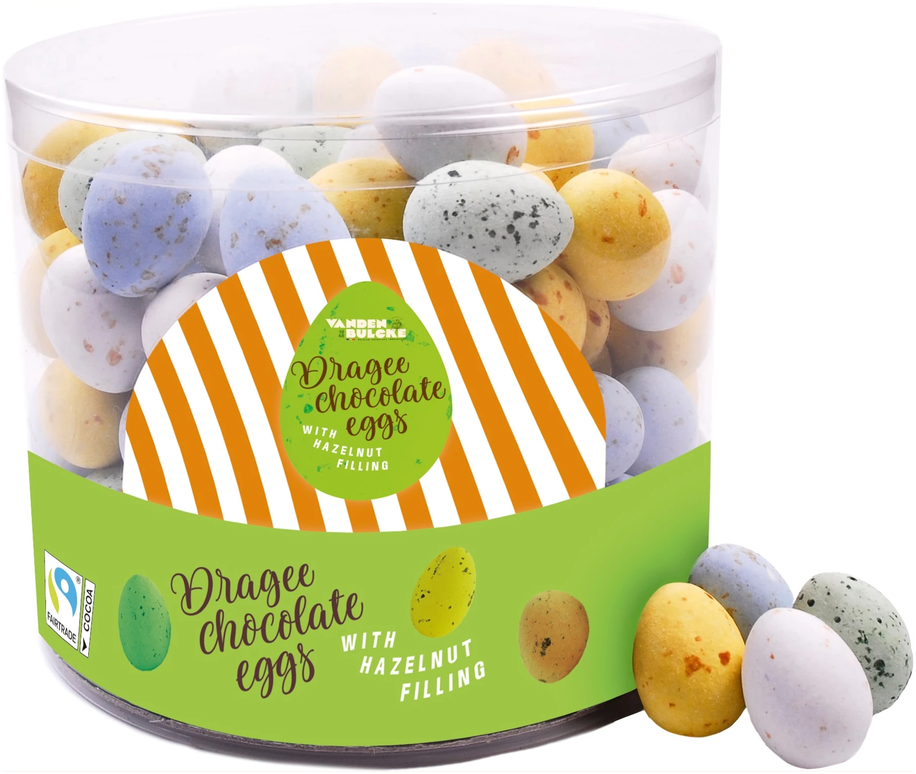 Dragee chocolade eitjes met hazelnoot praliné vulling.