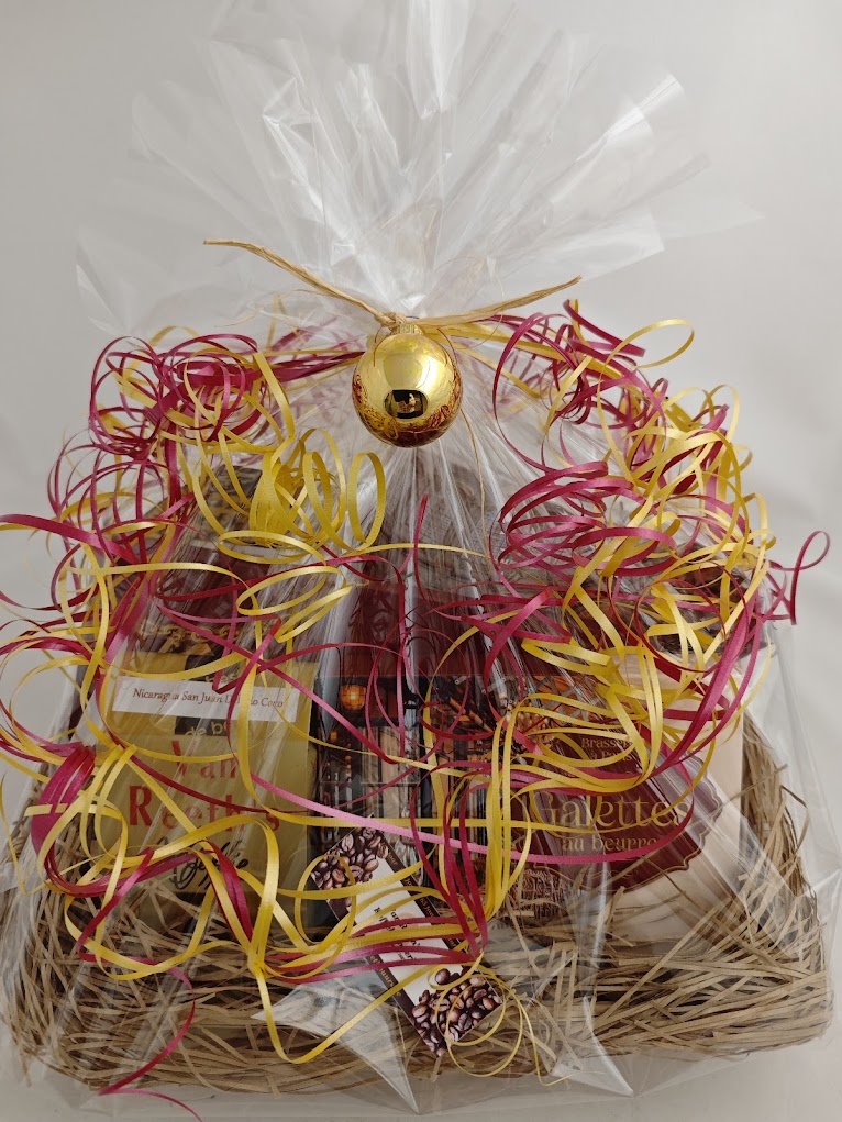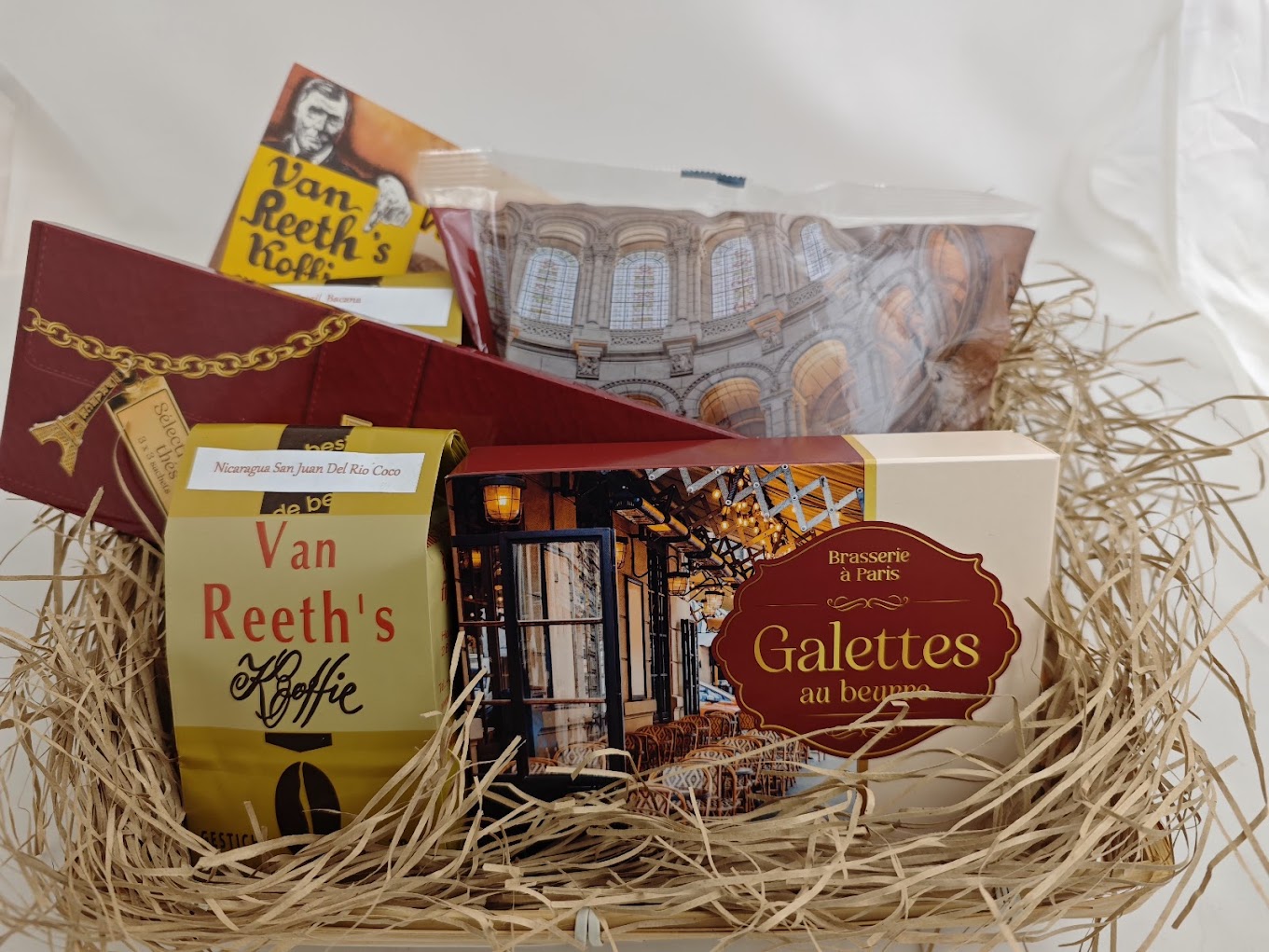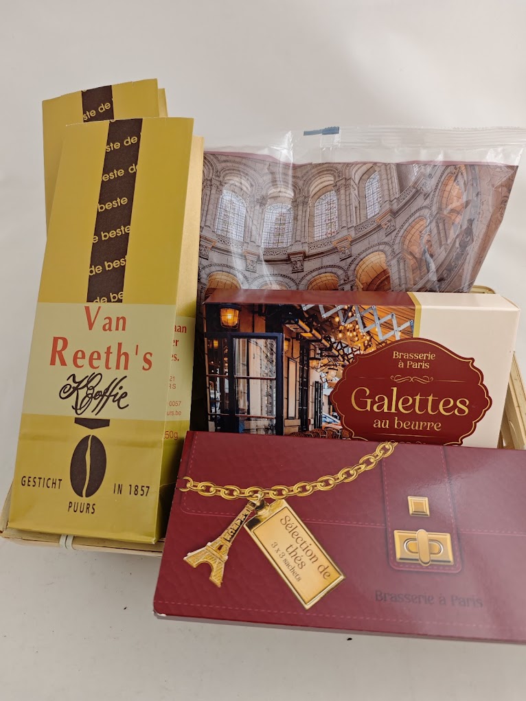 Geschenkmand met 2 pakjes 250 g koffie (gemalen of bonen), thee (3 x 3 zakjes), boter galetwafels en madeleintjes.