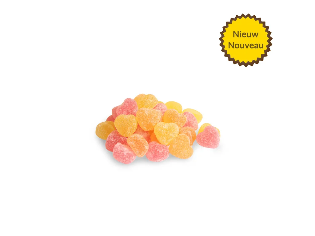 Mini fruit hartjes in 3 kleuren, framboos, sinaasappel & citroensmaak.