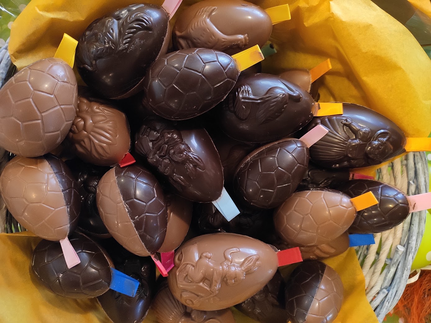 Chocolade holle eieren, helft puur en helft melk met bolletjes.