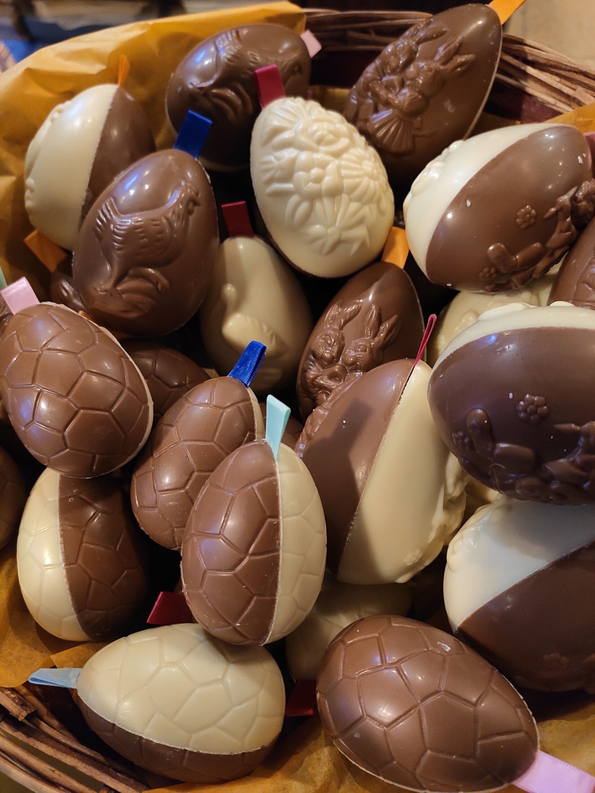 Chocolade holle eieren, helft wit en helft melk met bolletjes.